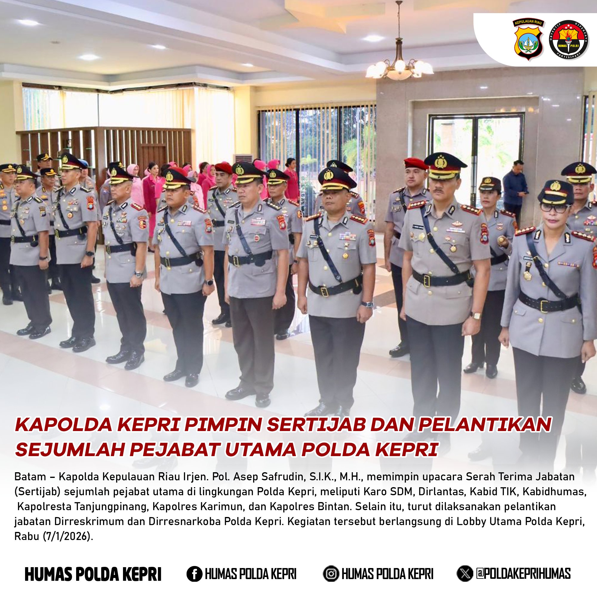 Batam, intuisi.net – Kapolda Kepulauan Riau (Kepri) Irjen. Pol. Asep Safrudin, S.I.K., M.H., memimpin upacara Serah Terima Jabatan (Sertijab) dan Pelantikan sejumlah Pejabat Utama (PJU) Polda Kepri di Lobby Utama Mapolda Kepri.