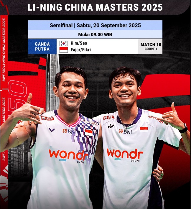 Di babak semifinal yang digelar Sabtu (20/9) malam WIB, Fajar/Fikri akan berhadapan dengan pasangan unggulan teratas peringkat satu dunia asal Korea Selatan, Kim Won Ho/Seo Seung Jae. Duet Korea ini dikenal dengan permainan agresif dan konsisten, yang baru saja lolos setelah mengalahkan lawan di perempat final. Pertarungan ini diprediksi sengit, mengingat Kim/Seo juga punya rekor head-to-head yang kuat. Namun, Fajar/Fikri tak gentar; mereka pernah mengejutkan unggulan di turnamen sebelumnya, termasuk juara di China Open 2025 lalu.