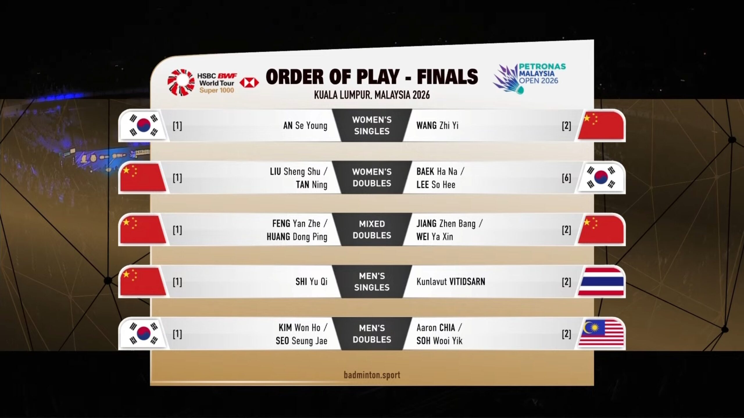 Turnamen ini didominasi oleh China, yang mengirimkan empat wakil ke final: Wang Zhi Yi di tunggal putri, Liu Sheng Shu/Tan Ning di ganda putri, Feng Yan Zhe/Huang Dong Ping serta Jiang Zhen Bang/Wei Ya Xin di ganda campuran, dan Shi Yu Qi di tunggal putra.