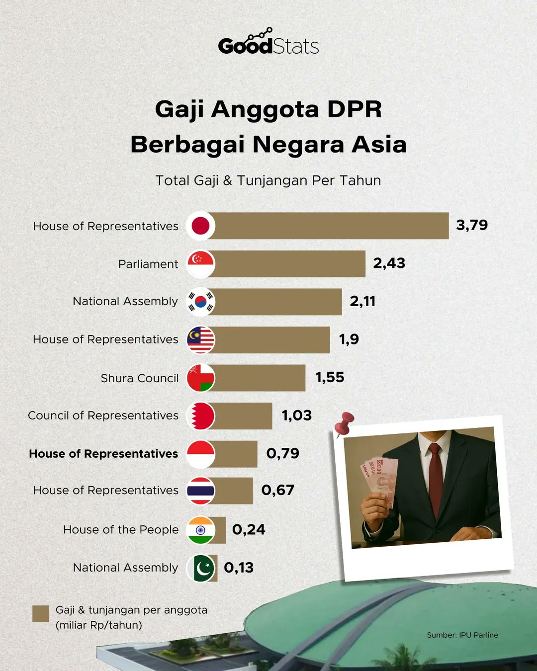 Menurut data dari GoodStats berdasarkan sumber IPU Parline, gaji dan tunjangan tahunan anggota DPR RI berada di peringkat rendah dibandingkan negara tetangga. Misalnya, anggota House of Representatives Jepang menerima Rp 3,79 Miliar per tahun, sementara anggota Parlemen Singapura mendapatkan Rp 2,43 Miliar. Bahkan, anggota National Assembly Korea Selatan memperoleh Rp 2,11 Miliar per tahun, dan House of Representatives Malaysia sekitar Rp 1,9 miliar. Negara seperti Bahrain (Council of Representatives) mencatat Rp 1,03 Miliar, masih jauh di atas angka Indonesia.