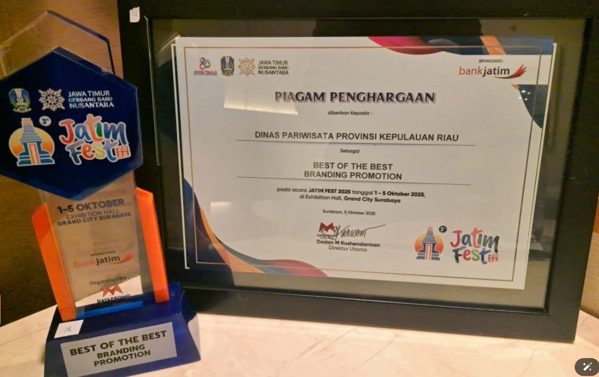 Kepri, intuisi.net – Dinas Pariwisata Provinsi Kepulauan Riau (Dispar Kepri) berhasil mencatatkan prestasi gemilang dengan meraih penghargaan Best of The Best Branding Promotion dalam ajang Jatim Fest 2025, yang digelar pada 1-5 Oktober 2025 di Grand City Exhibition Hall, Surabaya, Jawa Timur. Penghargaan ini diserahkan langsung oleh Wakil Gubernur Jawa Timur, Emil Elestianto Dardak, pada acara Closing Ceremony Jatim Fest 2025, Minggu (5/10/2025) malam.