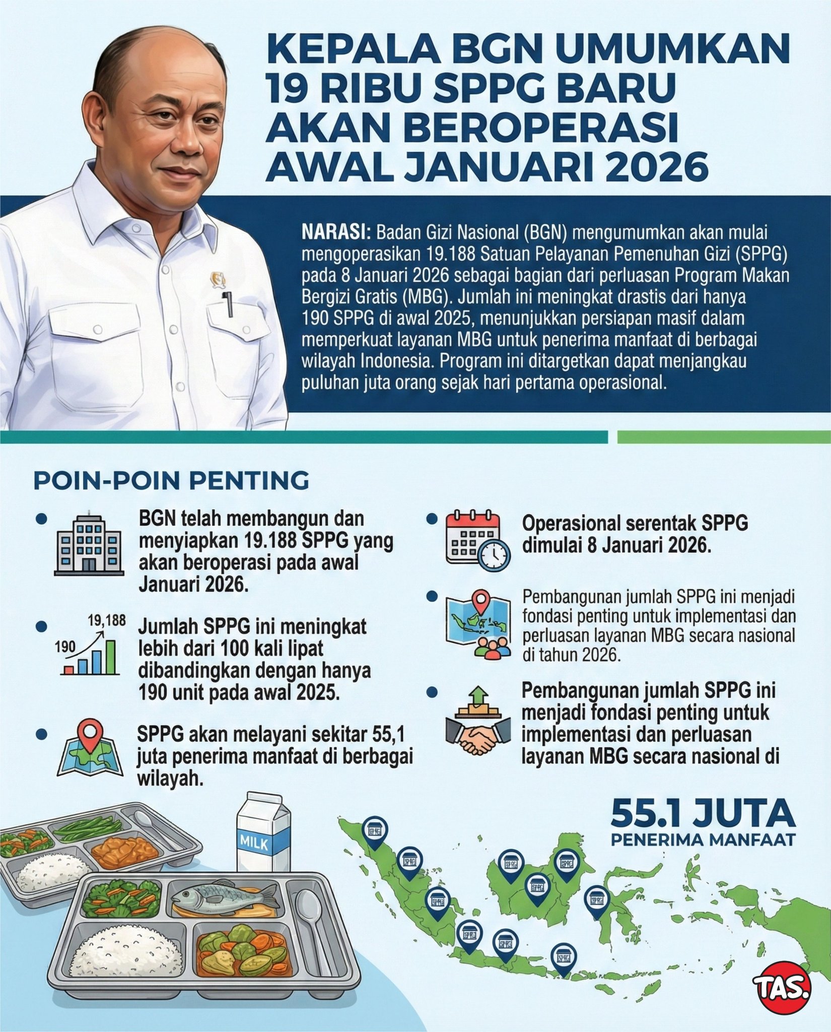 “Tahun 2025 kami gunakan sepenuhnya untuk membangun fondasi yang kuat. Dari hanya 190 SPPG di awal tahun hingga 19.188 SPPG di akhir tahun, ini menunjukkan kerja keras, masif, dan terukur dari seluruh pihak terkait dalam menyiapkan layanan MBG yang berkualitas,” ujar Dadan Hindayana di Jakarta, Kamis (1/1/2026).