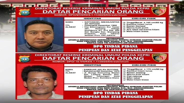 Batam, intuisi.net – Direktorat Reserse Kriminal Umum (Ditreskrimum) Polda Kepulauan Riau (Kepri) menetapkan dua tersangka dalam kasus dugaan penipuan dan penggelapan material bangunan senilai Rp4,1 miliar. Keduanya, Nathanael Simanjuntak alias Nathan dan Samsuar Adi alias Buyung (49), kini masuk dalam Daftar Pencarian Orang (DPO) setelah mangkir dari panggilan penyidik.