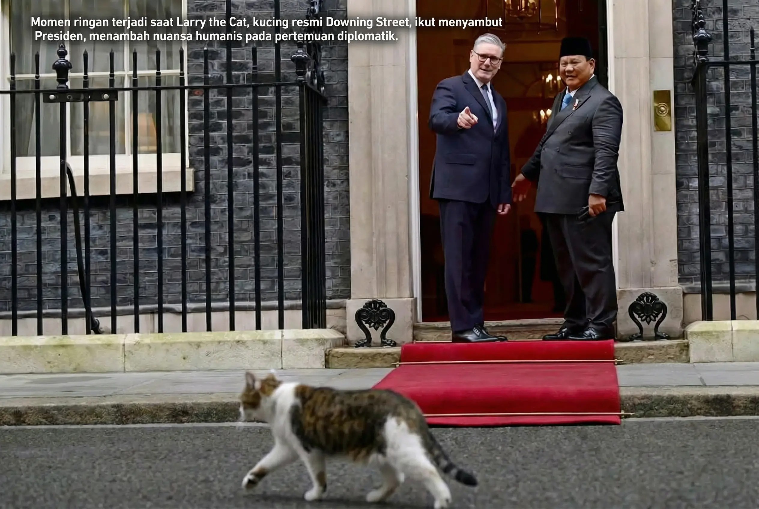 Momen ringan terjadi saat Larry the Cat, kucing resmi Downing Street, ikut menyambut Presiden, menambah nuansa humanis pada pertemuan diplomatik.