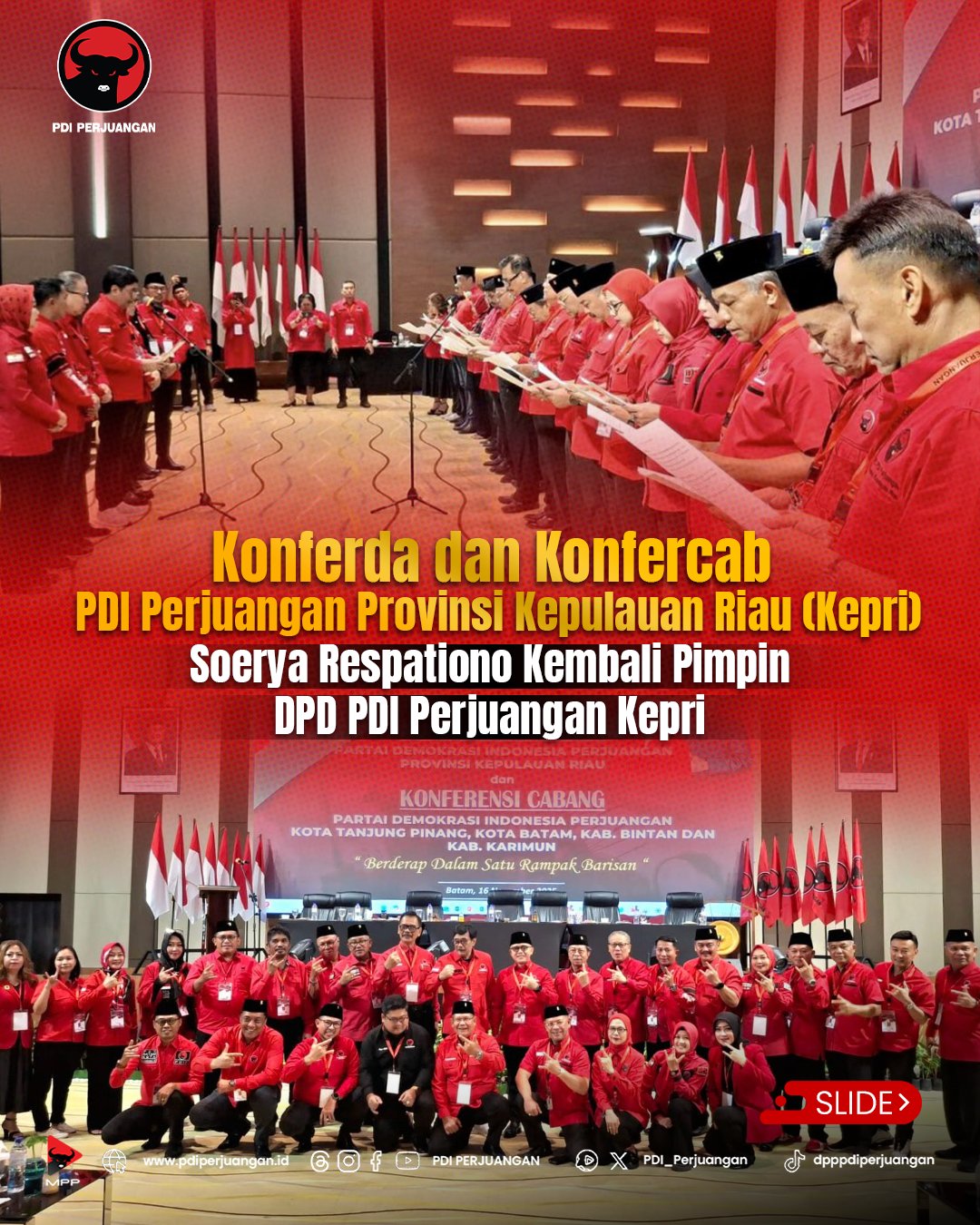 Kepri, intuisi.net – Soerya Respationo kembali pimpin DPD PDI Perjuangan Provinsi Kepulauan Riau (Kepri) untuk Periode 2025-2030. Ia terpilih dan dikukuhkan pada Konferensi Daerah (Konferda) PDI Perjuangan yang digelar di Aston Hotel Batam, Minggu (16/11/2025).